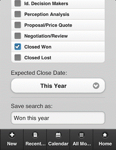 For example, you can create a search named "Won this year" where you select Opportunities in Closed Won sales stage and Expected Close Date This year.