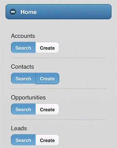 When Search is selected, the icon will be displayed on the home page. A Create button will be displayed on the home page if Create is selected.
