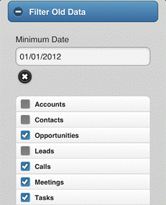 The "Filter Old Data" option allows you to hide all data created before a chosen date from all lists and subpanels. Usually you will want to keep all accounts and contacts, but you could hide all opportunities, calls and meeting created before a certain date.