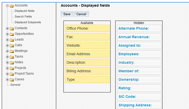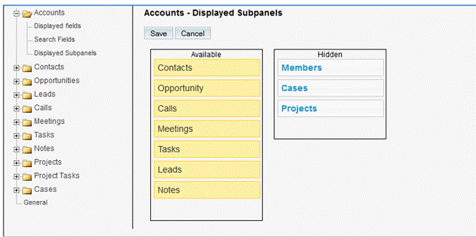 Select a module, then click on Displayed fields, Search Fields or Displayed subpanels.